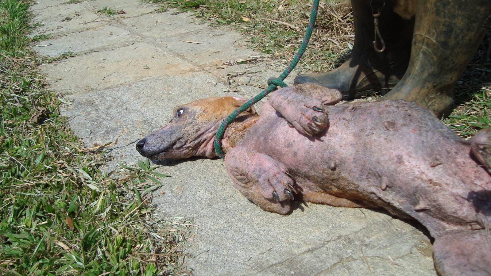 He was terrible depressed mentally and up until today still hasn't barked or played. He was abandoned as little more than a puppy and later on picked up by a mentally ill man who abused him. He has been with us a few weeks now and still has anemia and ongoing treatment for this. His mange is cured and his fur is growing back. He has learnt to smile.